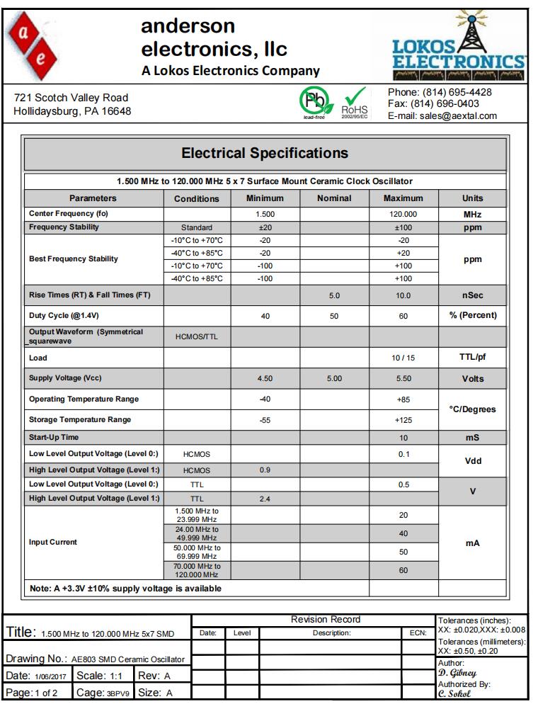 安德森晶振|AE803-T-H-B-4085-3R3-38M400000|6G光纖通道晶振規格表