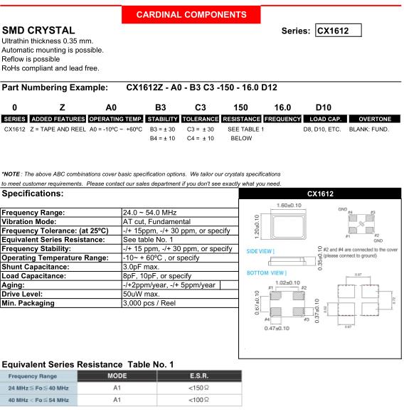更多>>美國(guó)Cardinal貼片晶振,CX1612小體積晶振,CX1612Z-A0B4C4-150-16.0D12晶振