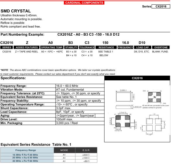 美國卡迪納爾晶振,CX2016貼片諧振器,CX2016Z-A0-B4C4-150-16.0D12晶振,貼片晶振本身體積小,超薄型石英晶體振蕩器,特別適用于有目前高速發展的高端電子數碼產品,因為貼片晶振本身小型化需求的市場領域,小型,薄型是對應陶瓷振蕩器(偏差大)和普通的石英晶體振蕩器(偏差小)的中間領域的一種性價比較出色的產品.產品廣泛用于筆記本電腦,無線電話,衛星導航SSD,USB,Blu-ray等用途,符合無鉛焊接的高溫回流焊曲線特性.