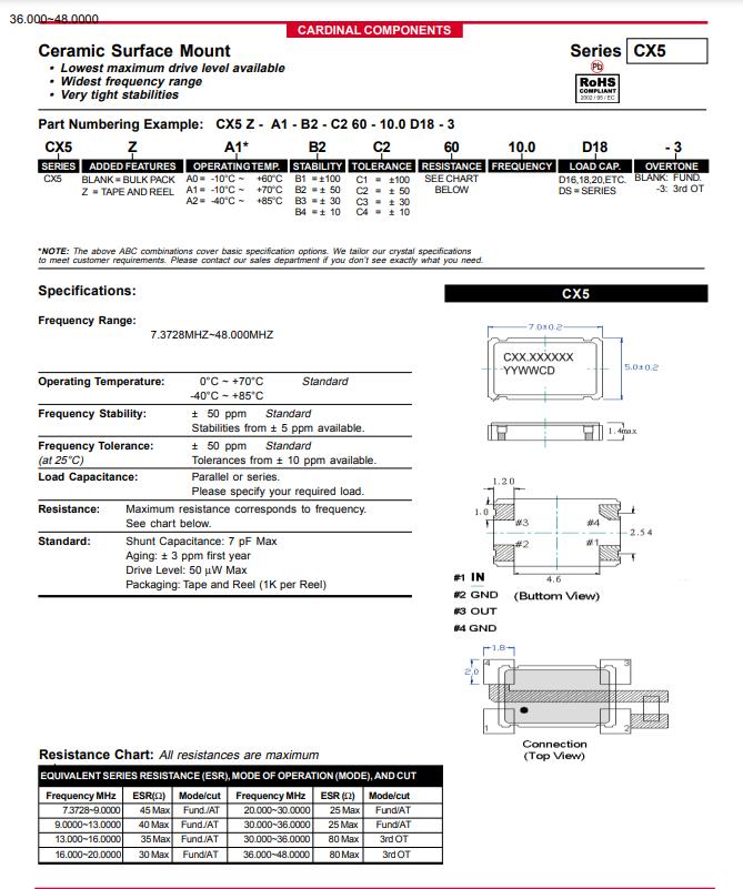 Cardinal卡迪納爾晶振,CX5四腳貼片晶振,CX5Z-A2-B3-C460-12.0D16-3晶振