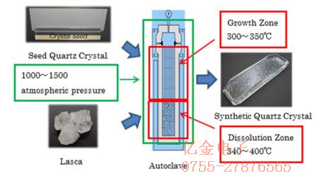 盡管石英確實以其晶體形式自然發生,但晶體不符合石英晶體諧振器所要求的質量.因此,晶體需要在高度受控的條件下人工生長.合成晶體使用晶種在約350℃和非常高的壓力下生長約1000個大氣壓.這是在專門制造的晶體生長爐中完成的,大約需要45到90天.