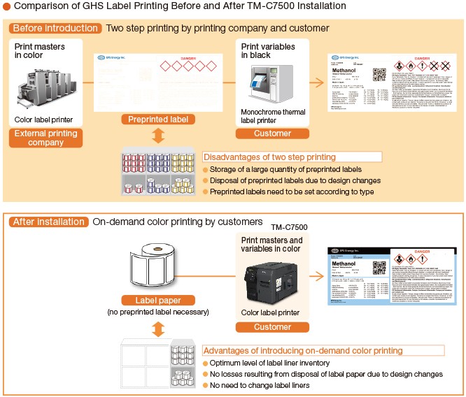 1.有必要為不同類型的化學品準備幾種預印標簽.此外,印刷承包商施加了最小的印刷量,導致庫存管理問題.2.處理通過設計變得過時的標簽的成本變化.3.打印條形碼需要時間. 為了解決客戶面臨的這些問題,愛普生晶振集團開發了TM-C7500的產品計劃,重點是實現色彩,高速度和高分辨率,以及能夠移動到能夠實現平滑,按需彩色標簽打印的環境.利用客戶現有的標簽打印環境.
