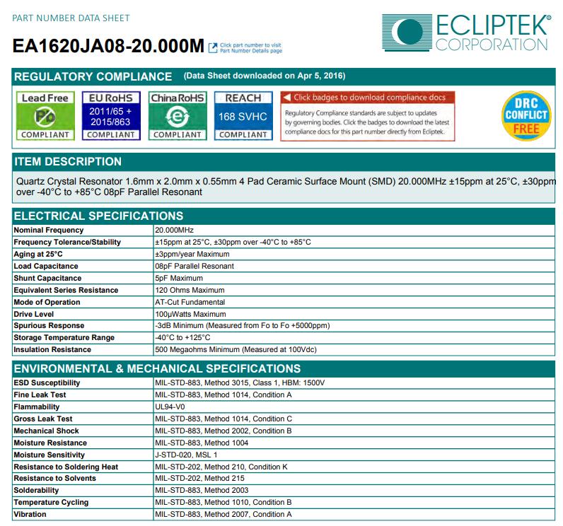 日蝕晶振,EA1620JA08-20.000M晶振,2016mm晶振本身體積小,超薄型石英晶體諧振器,特別適用于有目前高速發展的高端電子數碼產品,因為晶振本身小型化需求的市場領域,小型?薄型是對應陶瓷諧振器(偏差大)和普通的石英晶體諧振器(偏差?。┑闹虚g領域的一種性價比較出色的產品.產品廣泛用于筆記本電腦,無線電話,衛星導航HDD, SSD, USB, Blu-ray等用途,符合無鉛焊接的高溫回流焊曲線特性.