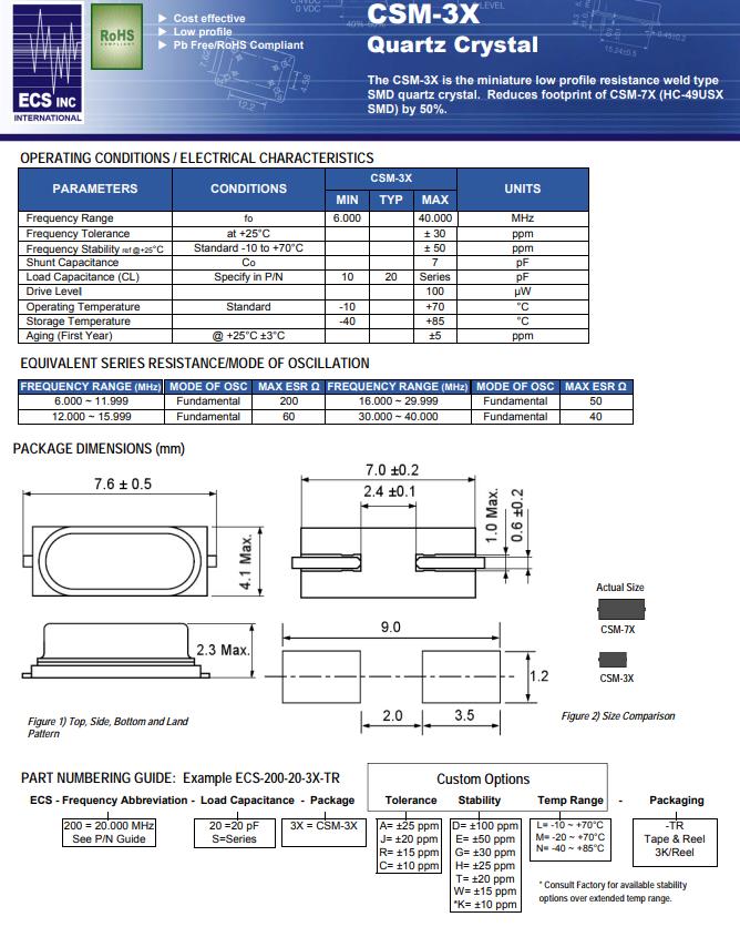 ECS-160-20-3X-TR,CSM-3X,ECS車載控制器晶振,16MHz晶振,美國進(jìn)口晶振,伊西斯晶振,ECS晶振,型號:CSM-3X,編碼為:ECS-160-20-3X-TR,頻率:16.000MHz,小體積尺寸:7.6x4.1mm封裝,CSM-3X是一種小型低輪廓電阻焊縫型SMD石英晶體,將CSM-7X(HC-49USX SMD)的占用空間減少50%。無源晶振,石英晶振,兩腳貼片晶振,石英晶體諧振器,橢圓型晶振,適用于移動(dòng)通訊設(shè)備,無線網(wǎng)絡(luò)晶振,藍(lán)牙模塊晶振,汽車電子晶振,車載晶振,數(shù)碼電子晶振,物聯(lián)網(wǎng)等應(yīng)用。