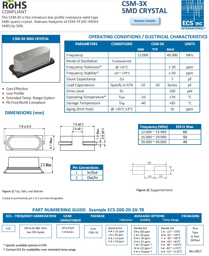 ECS-270-20-3X-TR | CSM-3X | MHz Crystal | 27MHz | ±50ppm | ±30ppm | 20pF |