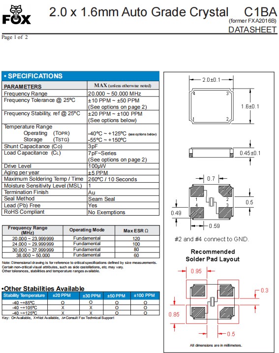 FC1BACBEI24.0-T3 | Fox 晶振 | C1BA | 24 MHz | ±50ppm | ±30ppm | 10pF | -40°C ~ 125°C |