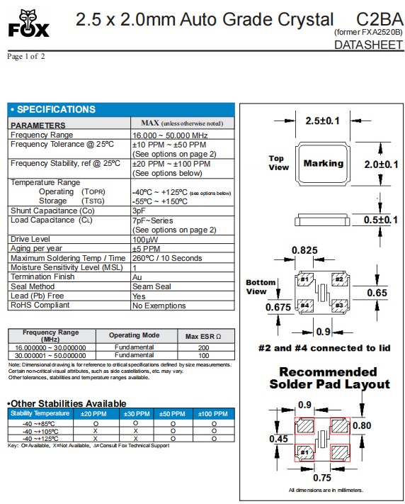 FC2BACBEI25.0-T3 | Fox 晶振 | C2BA | 25 MHz | ±50ppm | ±30ppm | 10pF | -40°C ~ 125°C |