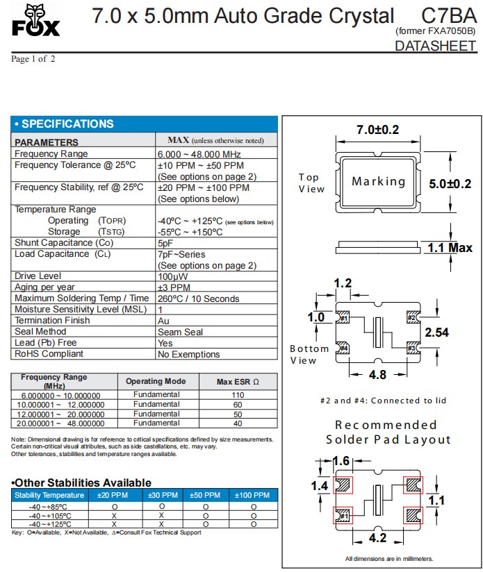 FC7BACBMI25.0-T1 | Fox 晶振 | C7BA | 25 MHz | ±50ppm | ±30ppm | 20pF | -40°C ~ 125°C |
