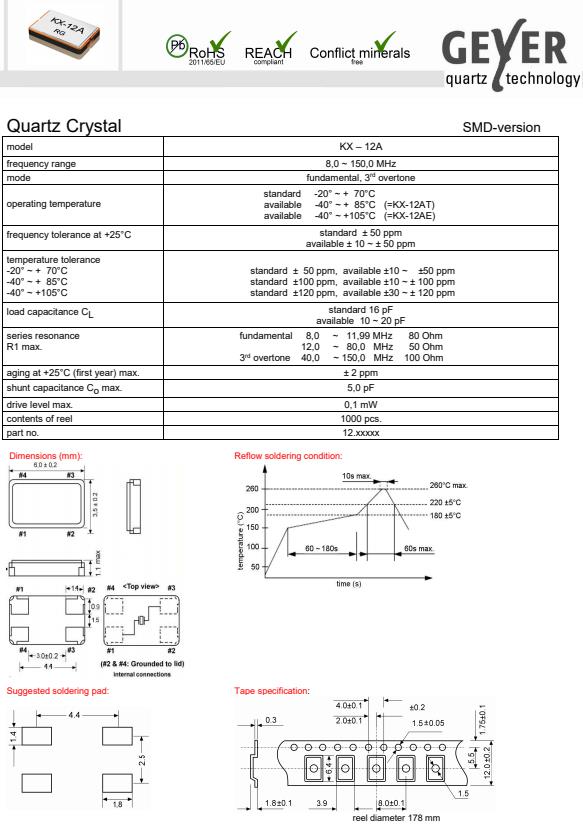 GEYER晶振,KX-12A高品質(zhì)晶振,SMD無源晶振,貼片晶振本身體積小,超薄型石英晶體振蕩器,特別適用于有目前高速發(fā)展的高端電子數(shù)碼產(chǎn)品,因為晶振本身小型化需求的市場領(lǐng)域,小型,薄型是對應(yīng)陶瓷振蕩器(偏差大)和普通的石英晶體振蕩器(偏差小)的中間領(lǐng)域的一種性價比較出色的產(chǎn)品.產(chǎn)品廣泛用于筆記本電腦,無線電話,衛(wèi)星導(dǎo)航SSD,USB,Blu-ray等用途,符合無鉛焊接的高溫回流焊曲線特性.