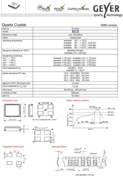 GEYER進口晶振,KX-6藍牙耳機晶振,SMD無源晶振,小型貼片石英晶振,外觀尺寸具有薄型表面貼片型石英晶體振蕩器,特別適用于有小型化要求的市場領域,比如智能手機,無線藍牙,平板電腦等電子數(shù)碼產(chǎn)品.晶振本身超小型,薄型,重量輕,晶體具有優(yōu)良的耐環(huán)境特性,如耐熱性,耐沖擊性,在辦公自動化,家電相關電器領域及Bluetooth,WirelessLAN等短距離無線通信領域可發(fā)揮優(yōu)良的電氣特性,滿足無鉛焊接的回流溫度曲線要求.