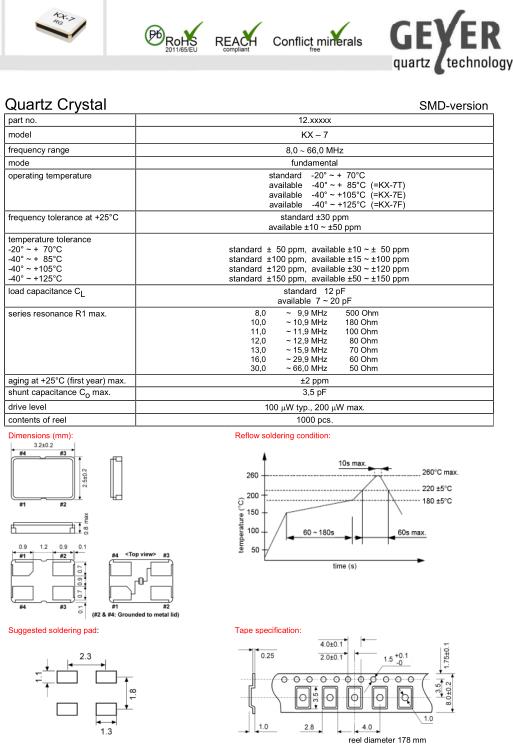 GEYER格耶晶振,KX-7高精度晶振,3225無源晶體,3225mm體積貼片晶振適用于汽車電子領域的表面貼片型石英晶振,本產(chǎn)品已被確定的高信賴性最適合用于汽車電子部件,晶體在極端嚴酷的環(huán)境條件下也能發(fā)揮穩(wěn)定的起振特性,晶振本身具有耐熱,耐振,耐沖擊等優(yōu)良的耐環(huán)境特性,滿足無鉛焊接的高溫回流溫度曲線要求,符合AEC-Q200標準.