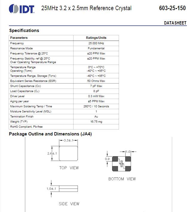 IDT晶振,603-25-150JA4I晶振,3225無源晶振