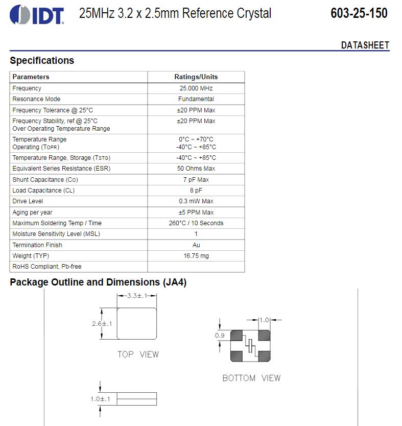 IDT晶振,603-25-150JA4I8晶振,3225無源晶振