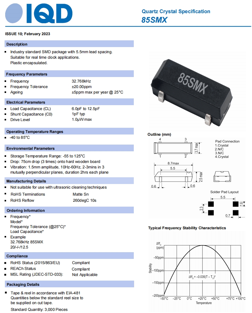 IQD音叉晶振,85SMX千赫晶體,6G相關設備晶振規格表