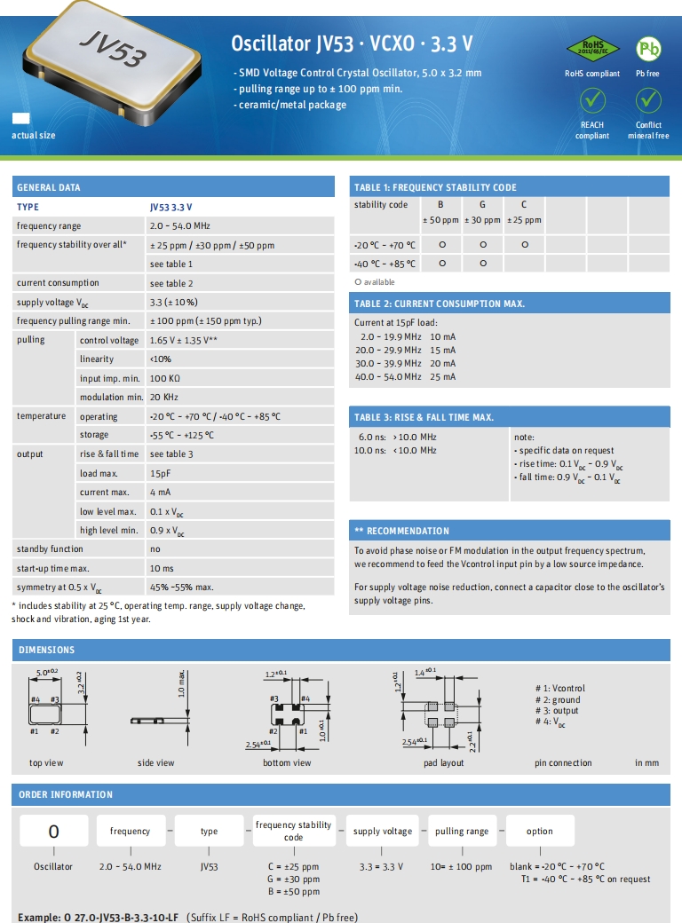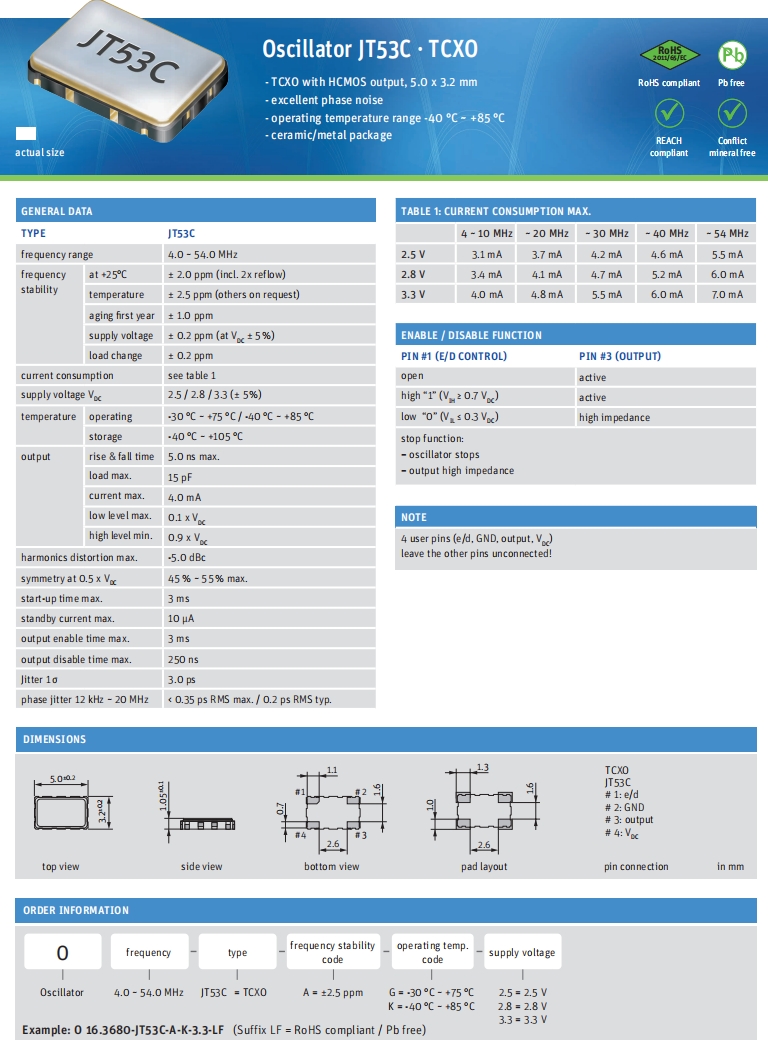Jauch溫補晶振,O 26.0-JT53C-A-G-3.3-LF,6G移動無線電晶振規格表