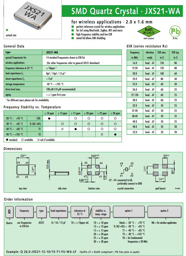 Q 19.2-JXS21-8-10/10-WA-LF | Jauch晶振 | JXS21-WA | 19.2MHz | ±10ppm | 8pF |