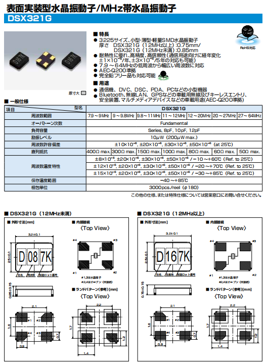 KDS晶振 | 7AD01200A1R | DSX321G | 3225 | 12.000MHZ | |||||
