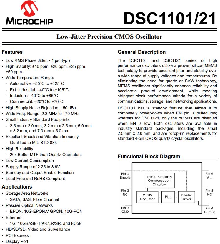 DSC1121NI2-125.0000 | Microchip Technology | DSC1121 | 125MHz | 2.25 V ~ 3.6 V | 0.276" L x 0.197" W (7.00mm x 5.00mm) |