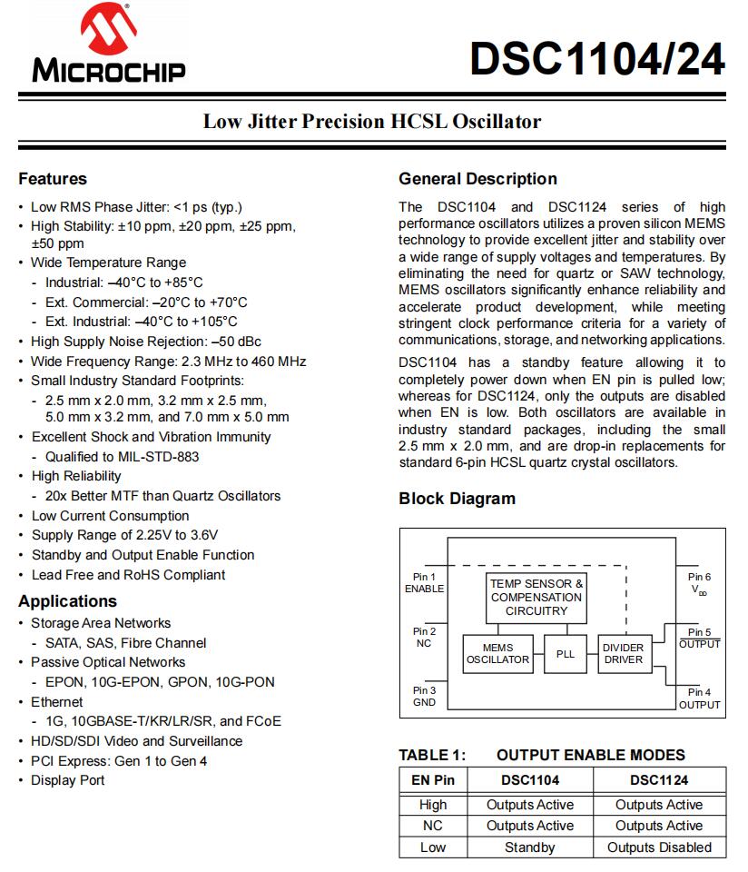 DSC1124NI1-100.0000 | Microchip Technology | DSC1124 | 100MHz | 2.25 V ~ 3.6 V | 0.276" L x 0.197" W (7.00mm x 5.00mm) |