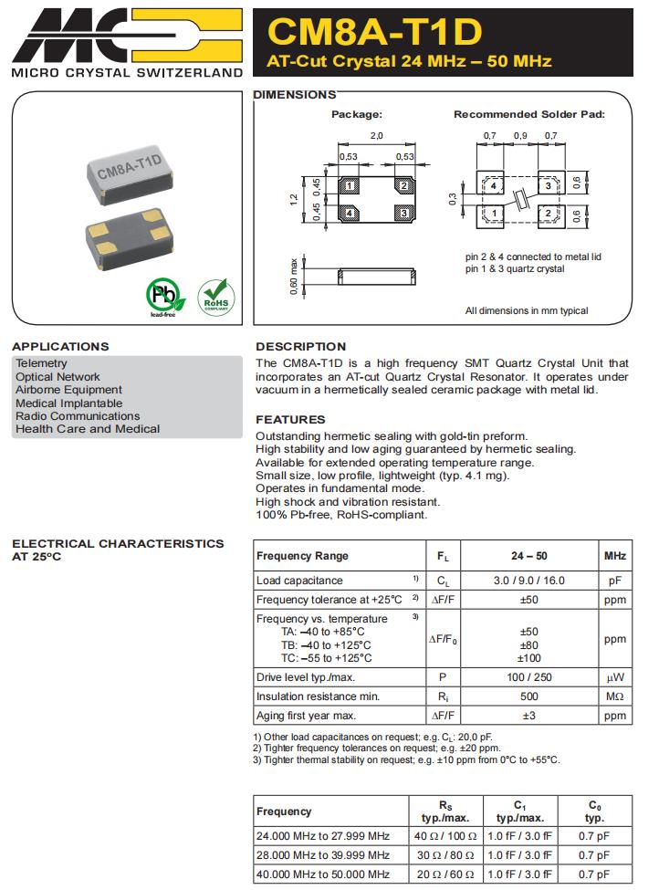 CM8A-T1D-27.000MHz-16.0pF-50ppm-TB-QI|2012四腳貼片晶振|6G光纖通道晶振,瑞士微晶晶振,CM8A-T1D石英晶體諧振器,CM8A-T1D-27.000MHz-16.0pF-50ppm-TB-QI晶振,2012四腳貼片晶振,頻率27MHz,負載16pf,頻率穩定性50ppm,工作溫度-40~125°C,低老化振,高可靠性晶振,6G光纖通道晶振,醫用植入式晶振,無線電通信設備晶振,家用保健和醫療設備晶振.