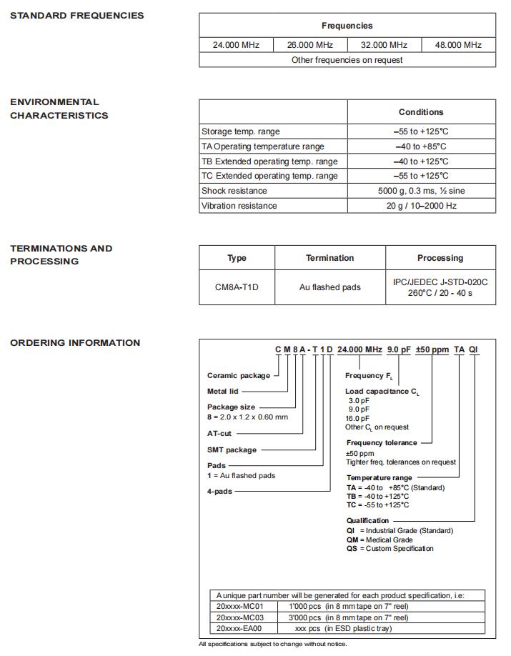 CM8A-T1D-27.000MHz-16.0pF-50ppm-TB-QI|2012四腳貼片晶振|6G光纖通道晶振規格表