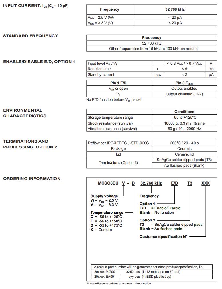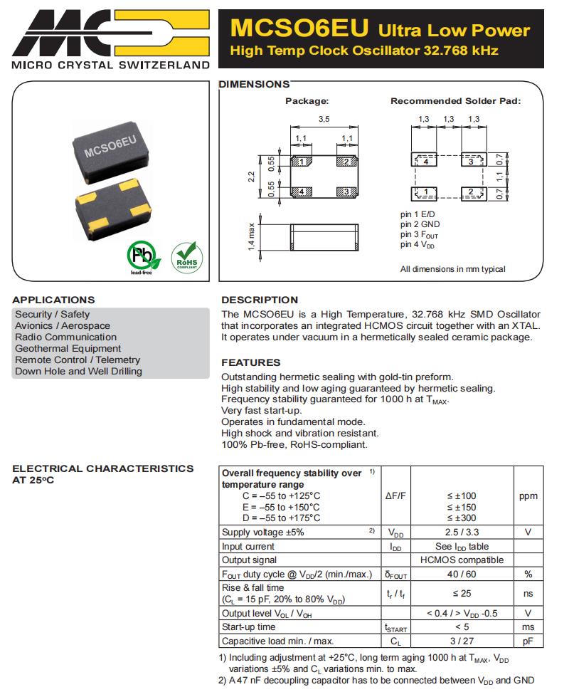 MCSO6EUV-E-32.768kHz-E/D-T3|32.768KHz有源晶振|6G發射器晶振,Micro晶振,MCSO6EU進口晶振,MCSO6EUV-E-32.768kHz-E/D-T3晶振,3522mm晶振,有源晶振,頻率32.768KHz,電壓3.3V,頻率穩定性100ppm,工作溫度-55~150°C,耐高溫晶振,低老化晶振,6G發射器晶振,無線電通信晶振,安保應用晶振,地熱設備晶振,井下和鉆井應用晶振.