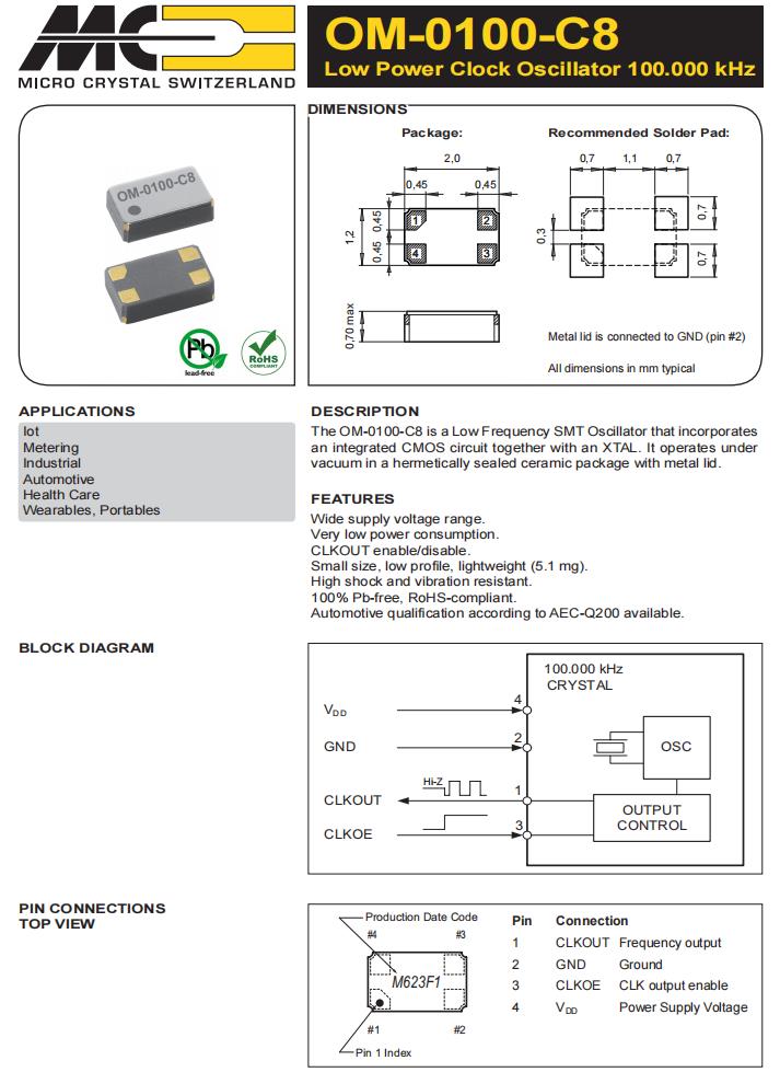 OV-0100-C7-100.000kHz-50PPM-TA-QC | Micro Crystal | 標準時鐘振蕩器 100.0 kHz +/-50 PPM -40/+85C |
