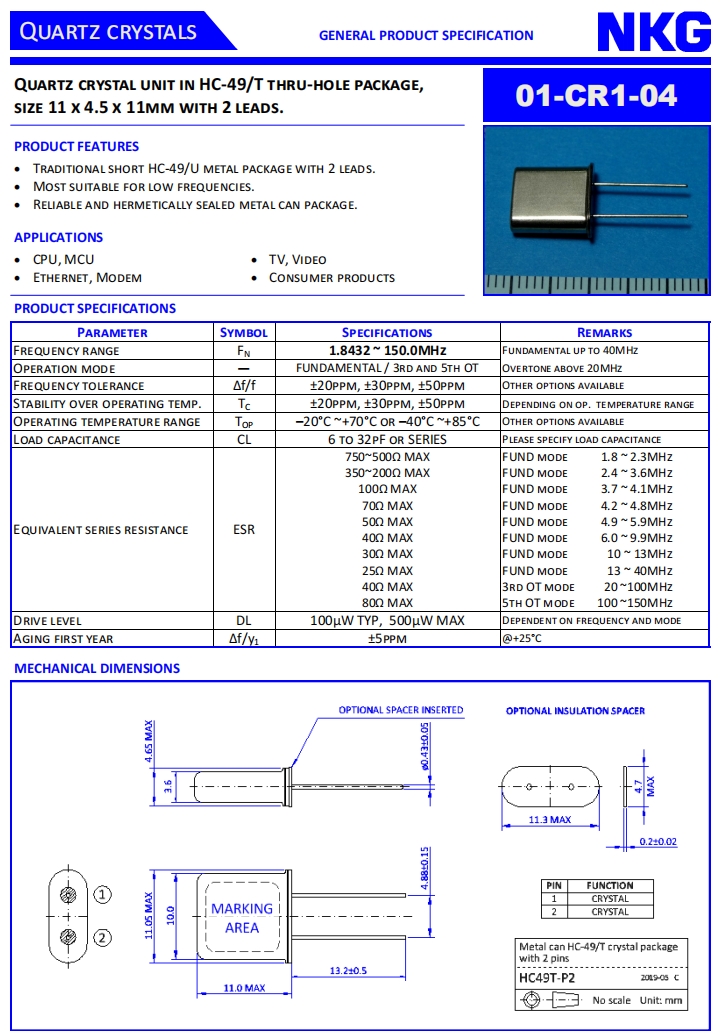 NKG晶振|01-CR1-04-25M000-T20-2030M-EXT|HC-49U插件晶振,香港晶振品牌,NKG晶振,01-CR3-04進口晶振,HC-49U插件晶振,01-CR1-04-25M000-T20-2030M-EXT晶振,石英晶體諧振器,無源晶振,11x4.5x11mm晶振,頻率25MHz,負載20pF,工作溫度-40~85°C,頻率容差20pm,高質量晶振,高精度晶振,低老化晶振,調制解調器晶振,消費類電子產品晶振,CPU晶振,家用電視機頂盒晶振.