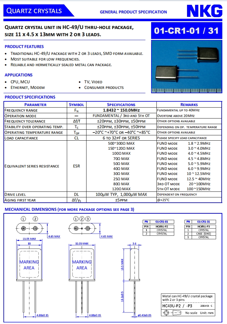 NKG晶振|01-CR1-31-20M000-T18-3050E-EXT|三腳插件晶振,NKG晶振,01-CR1-31無源晶振,三腳插件晶振,01-CR1-31-20M000-T18-3050E-EXT晶振,HC-49U晶振,石英晶體諧振器,11x4.5x13mm晶振,頻率20MHz,負載18pF,工作溫度-20~70°C,頻率容差30pm,無鉛環保晶振,高可靠性晶振,低老化晶振,智能電視晶振,消費電子產品晶振,以太網晶振,專業視頻設備晶振.