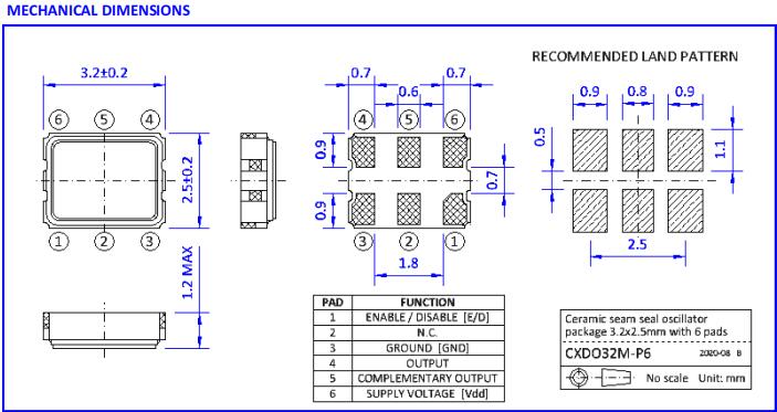●SMD封裝尺寸為3.2 x 2.5 x 1.0mm,帶有6個(gè)襯墊