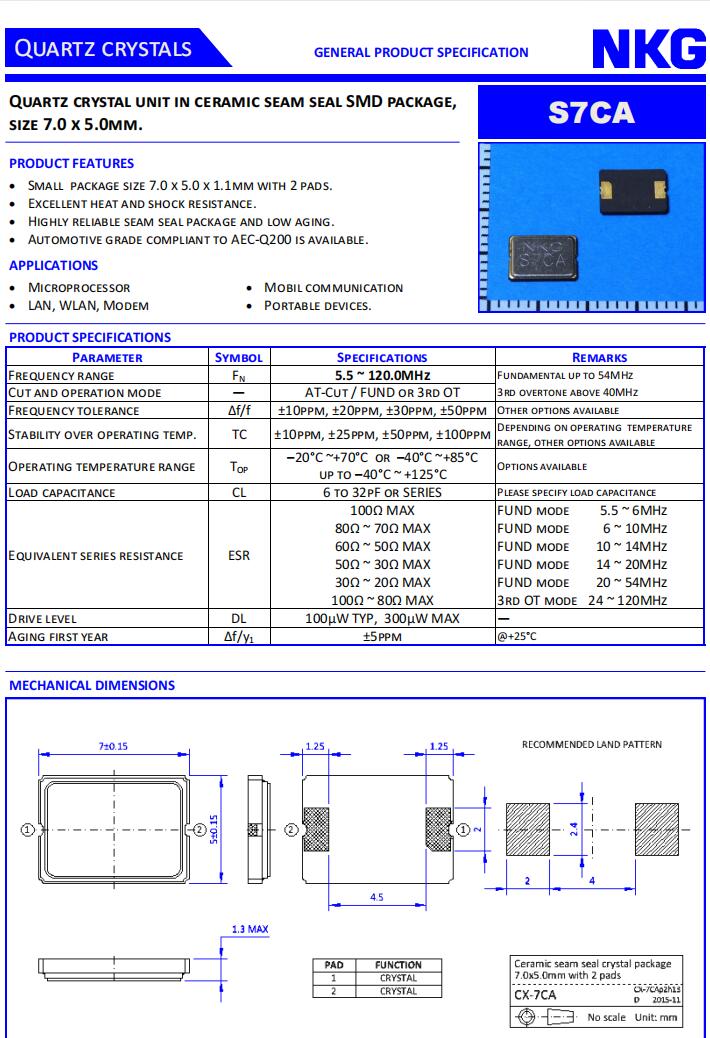 香港NKG晶振|S7CA40.000F20M23-EXT|7050無(wú)源晶振規(guī)格表