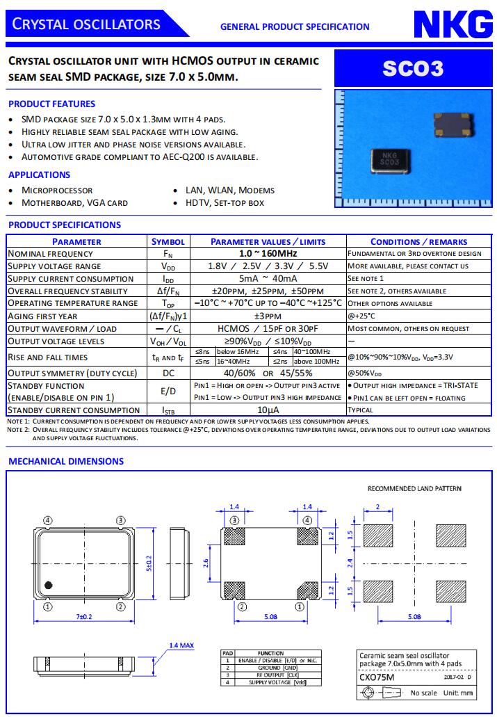 NKG晶振|SCO3-6-B-25.0000-MTS-EXT|7050mm貼片晶振規格表