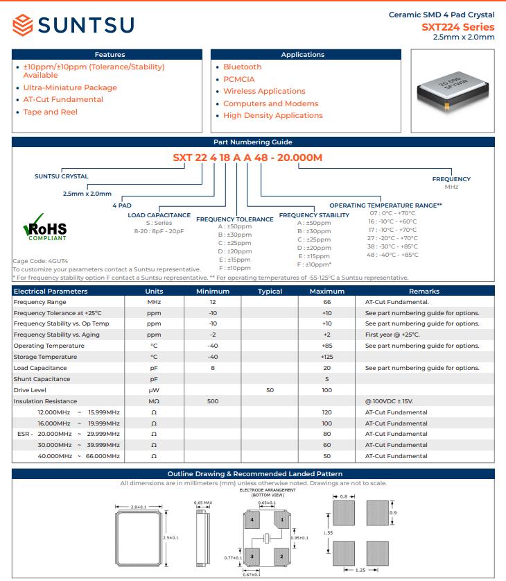 SXT22410AA16-48.000M | 2.5X2.0 SMD (4 PAD) CRYSTAL | 10pF | ±50ppm | 48.000M |