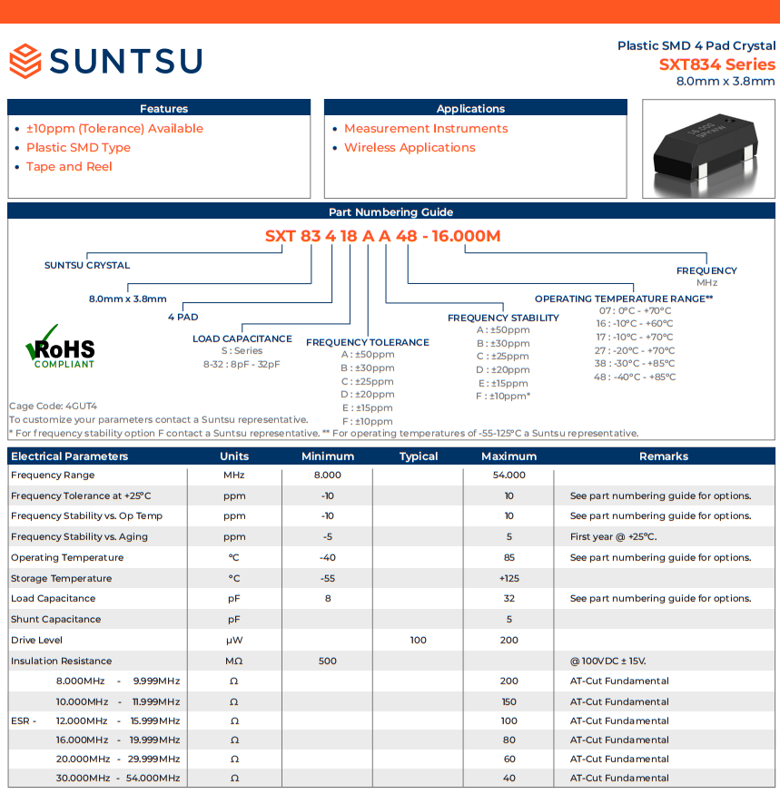 SXT83418AA17-24.000M | 8.0X3.8 PLASTIC SMD (4 PAD) Crystal | 18pF | ±50ppm | 24.000M |