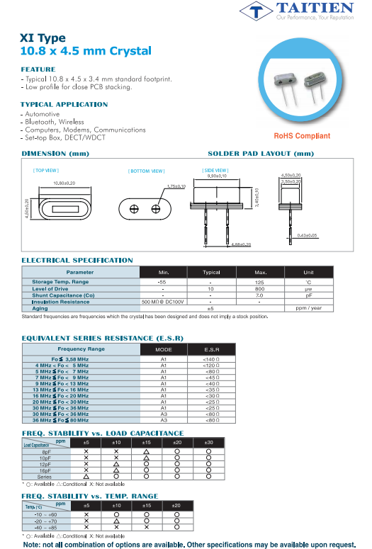 TAITIEN原廠編碼 | 生產廠家 | 型號 | 頻率 | 頻率穩定度 | 頻率偏差 | 負載電容 |