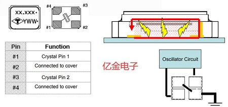 那么想要最大限度降低EMI對振蕩器的影響,到底需要注意那幾點呢?對于TATIEN晶體振蕩器,頂部金屬蓋電連接到GND端子.金屬蓋可有效屏蔽振蕩器內部ASIC產生的EMI.如下圖所示: