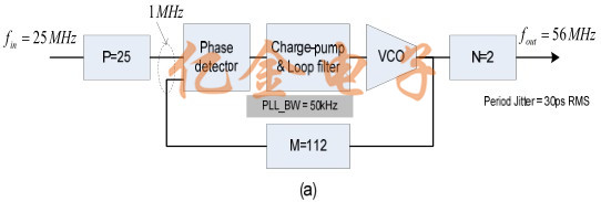 典型的整數PLL包括預分頻器(P),反饋分頻器(M)和后分頻器(N),如圖所示在圖1中.輸出頻率由定義等式1.