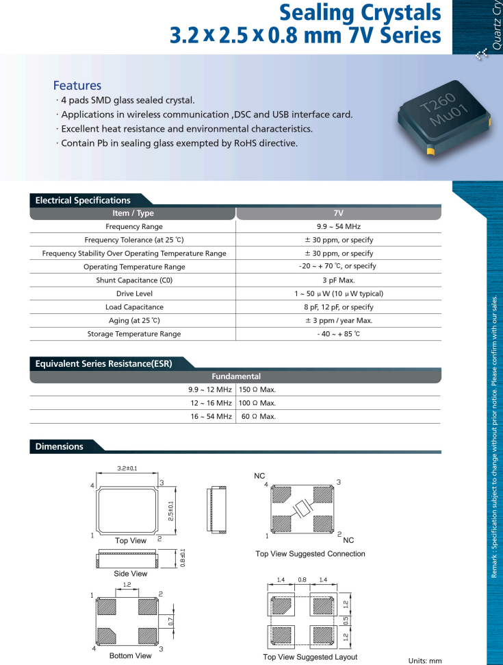 7V-54.000MAAE-T|54MHz|30PPM|3225|TXC|-20~70℃,臺灣TXC晶振公司,SMD玻璃密封晶體3.2 x 2.5 x 0.8 mm 7V系列,4個墊片,SMD玻璃密封晶體。應用于無線通信、DSC和USB接口卡。優異的耐熱性和環境特性。在受RoHS指令豁免的密封玻璃中含有鉛。