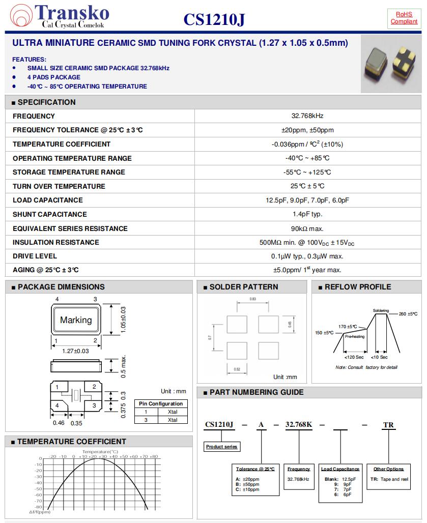 美國Transko晶振,CS1210J-A-32.768K-9-TR,車載遙控器應用晶振規格表