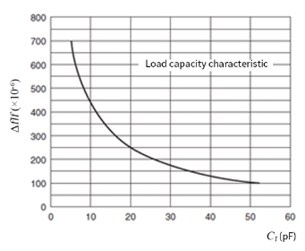 如上所述,石英晶體振蕩器的串聯(lián)諧振頻率會根據(jù)振蕩器電路的負載電容 CL 而變化,但在實際的振蕩器電路中,振蕩頻率是通過使用微調(diào)電容器等改變 CL 來微調(diào)的。 右圖是負載電容特性的一個例子,但該特性的斜率會根據(jù)晶體的頻率、形狀、泛音順序等而變化。