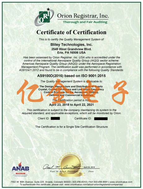 Bliley晶振的Erie工廠于2018年2月獲得認證,展示了完全記錄并實施的質量管理體系,該體系已通過AS9100:2016標準認證.