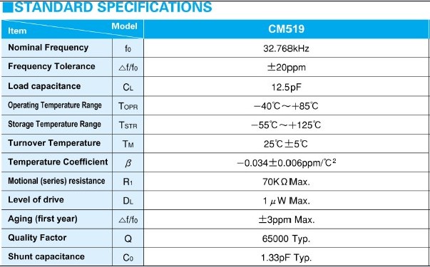 西鐵城晶振CM519|超小型、薄型、質地輕的表面貼片音叉型晶體諧振器、具備優良的耐熱性、耐環境特性、在辦公自動化金屬外殼的使用使得產品在封裝時能發揮比陶瓷外殼更好的耐沖擊性。