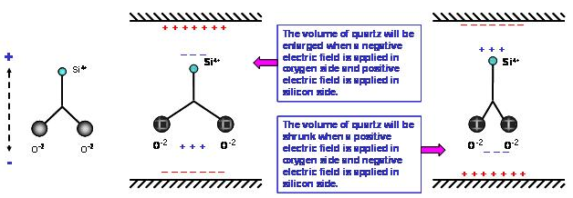 石英材料中的二氧化硅分子(SiO2) 在正常狀態(tài)下, 其電偶極是互相平衡的電中性. 在(如圖)的二氧化硅是以二維空間的簡化圖形. 當(dāng)我們?cè)诠柙由戏郊把踉酉路椒謩e給予正電場(chǎng)及負(fù)電場(chǎng)時(shí), 空間系統(tǒng)為了維持電位平衡, 兩個(gè)氧原子會(huì)相互排斥, 在氧原子下方形成一個(gè)感應(yīng)正電場(chǎng)區(qū)域, 同時(shí)在硅原子上方產(chǎn)生感應(yīng)負(fù)電場(chǎng)區(qū)域. 相反的情況, 當(dāng)我們?cè)诠柙由戏郊把踉酉路椒謩e給予負(fù)電場(chǎng)及正電場(chǎng)時(shí), 兩個(gè)氧原子會(huì)相互靠近, 氧原子下方產(chǎn)生感應(yīng)負(fù)電場(chǎng),硅原子上方產(chǎn)生感應(yīng)正電場(chǎng). (如圖). 然而, 氧原子的水平位置變化時(shí),迫使氧原子回到原來的空間位置. 因此, 電場(chǎng)的力量與原子之間的力量會(huì)相互牽動(dòng), 電場(chǎng)的改變與水平方向的形變是形成交互作用狀態(tài).