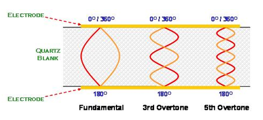 在AT切割角度的石英晶體共振子主要是以厚度剪切振蕩模態存在. 石英晶體在共振時, 除了基本波振蕩之外, 高階的倍頻共振也與基本波振蕩同時存在于石英晶體的電極區域之間. 但是, 由于壓電材料的電極是電氣相位相反的振動環境, 所以, 祇有奇數倍(odd number)的高頻倍頻可以發生, 偶數倍(even number)的倍頻共振在石英晶體共振子是不會存在的(如左圖).