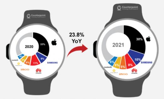 調研2021年智能手表銷售份額,華為居第三,蘋果依然獨領風騷