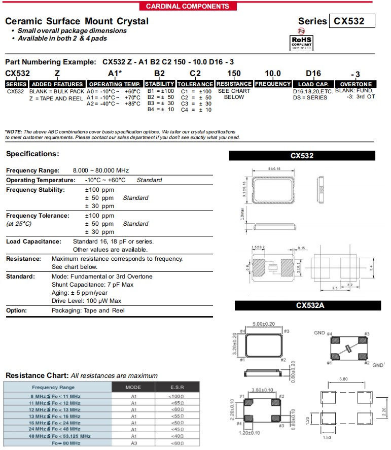 美國進口晶振,Cardinal卡迪納爾晶振CX532,是一款小體積晶振尺寸5.0x3.2mm表面貼裝晶體,整體封裝尺寸小,CX532晶振兩腳貼片晶振 和CX532A晶振四腳貼片晶振可供選擇,無源晶振,石英晶振,貼片晶振,石英晶體諧振器,頻率范圍:8MHz-80MHz,頻率穩定度:±30ppm,工作溫度范圍:-40℃至+85℃,無鉛環保晶振,該石英晶體諧振器具有超小型,輕薄型,耐熱及耐環境特點,被廣泛用于通訊設備,無線局域網,藍牙模塊晶振,汽車電子,醫療設備,數碼電子,平板電腦,物聯網應用等。無線局域網應用晶振CX532Z-A5B3C5-70-20.0D18
