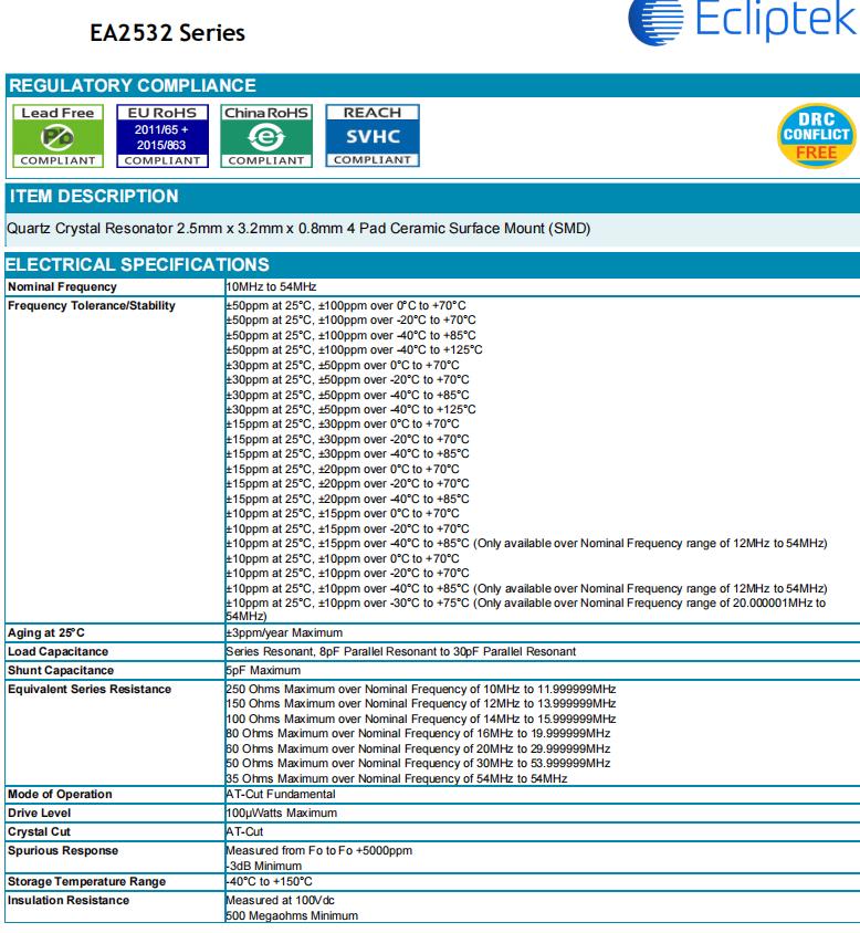 EA2532QA18-16.000M TR | Ecliptek石英晶體 | EA2532 | MHz 晶體 | 16 MHz | ±20ppm | ±15ppm | 18pF | CRYSTAL 16.0000MHZ 18PF SMD |