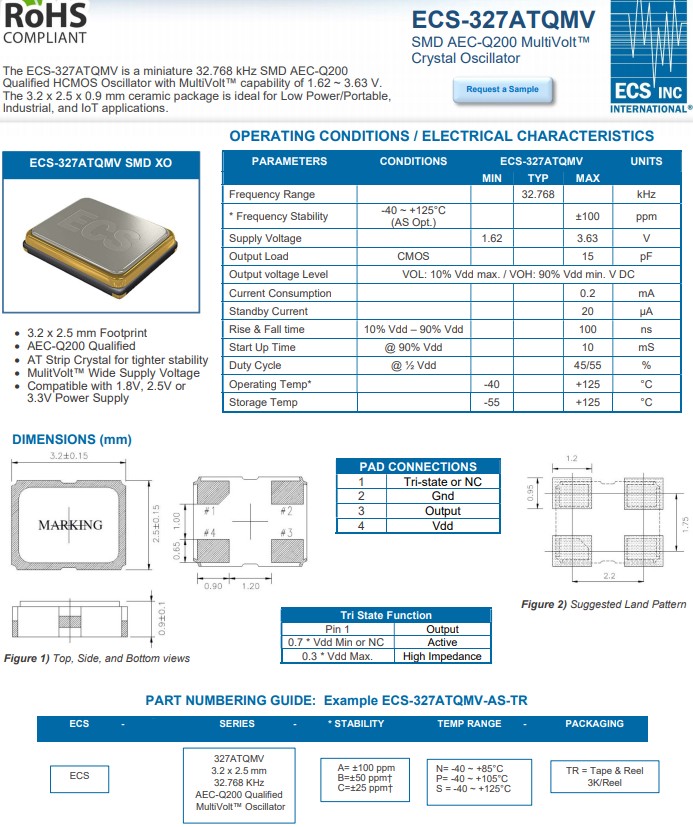 ECS-327ATQMV-AS-TR低功耗32.768K振蕩器非常適合便捷式應用