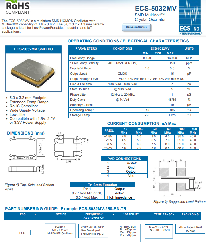 ECS晶振ECS-5032MV是一款微型SMD HCMOS石英晶體振蕩器,具有低功耗、固定頻率、低抖動和MultiVolt(1.6V至3.63V)功能。它們采用工業(yè)標準封裝,尺寸為5.0x3.2x1.3毫米(LWH)陶瓷封裝四腳貼片晶振。MultiVolt特性允許客戶將同一器件用于多種設計,從而降低認證要求并減少庫存。非常適合低功耗/便攜式、工業(yè),物聯(lián)網(wǎng),存儲設備,導航和無線設備等應用。ECS-5032MV-250-BN-TR非常適合導航和無線設備應用