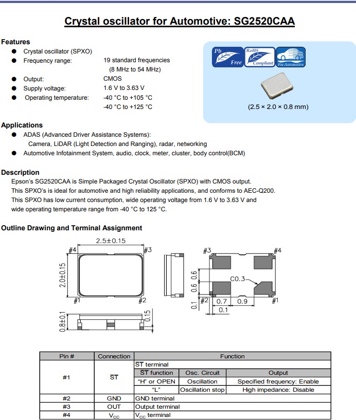 愛普生SG2520CAA具有高響應速度的2520封裝汽車級晶振,X1G005951001216,CMOS輸出晶體振蕩器